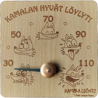 En humoristisk bastutermometer med Kamala Luonto-tema, tillverkad av finsk värmebehandlad massiv björk.
